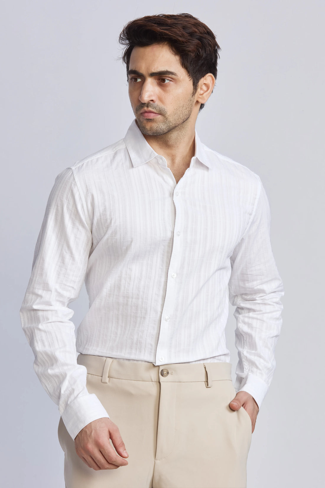 Fabric: 100% CottonPattern: Self Dobby StripeCollar: Regular CollarFit: Slim FitPlacket: FrenchBottom Hem: Round/ RegularColour: White Occasion:...