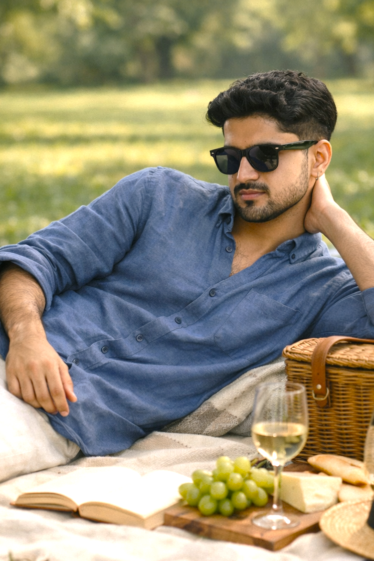 STEEL BLUE LINEN BLEND MANDARIN COLLAR SHIRT