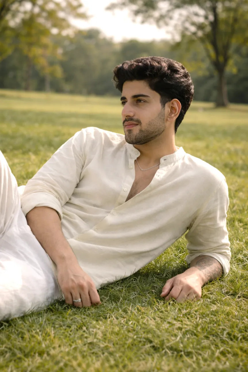 BEIGE LINEN BLEND MANDARIN COLLAR SHIRT