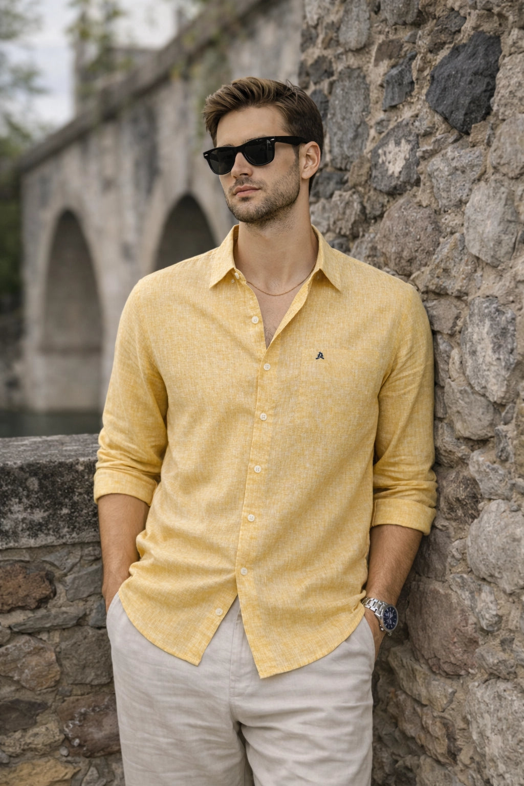 AMBER YELLOW CHAMBRAY REGULAR FIT LINEN SHIRTS