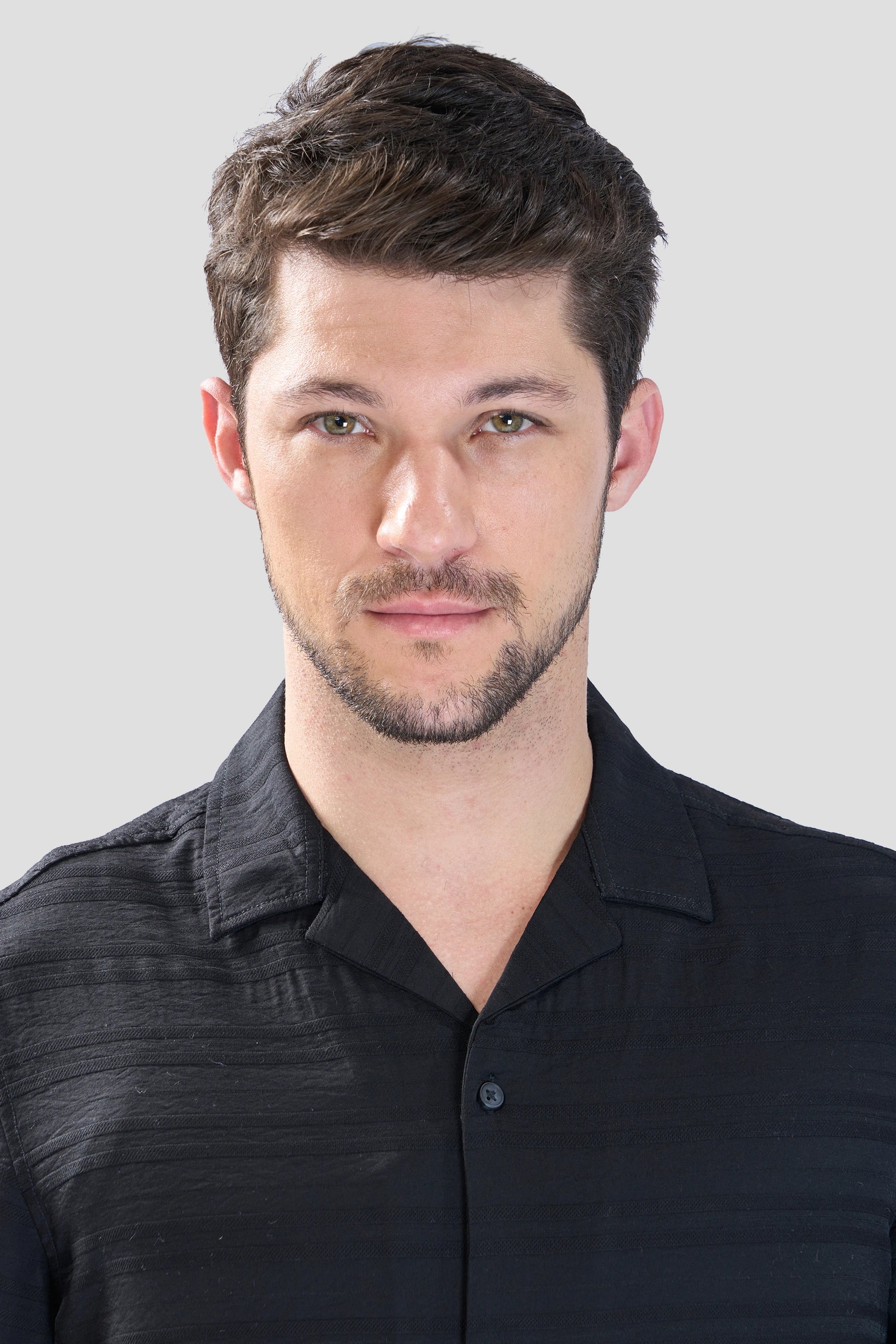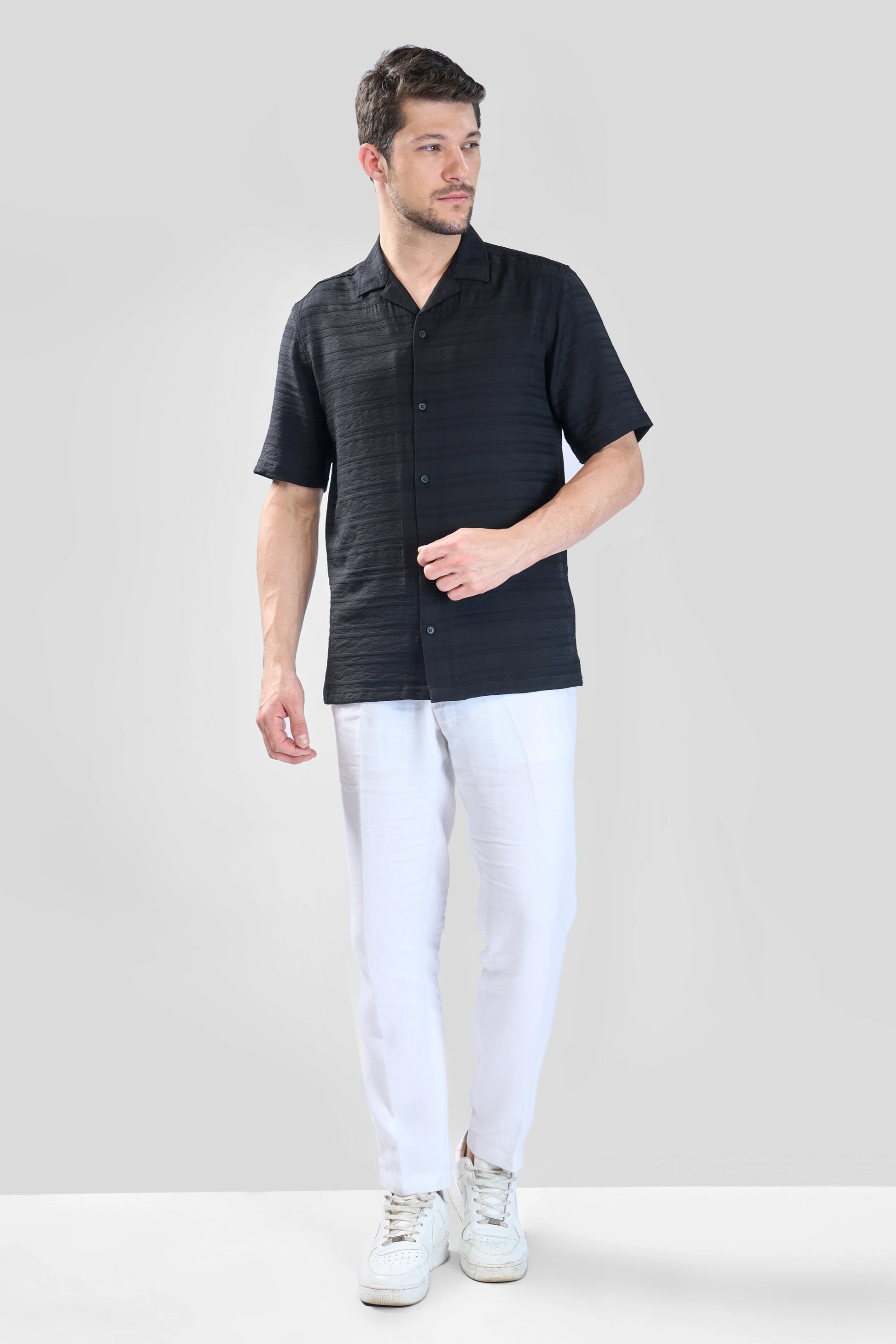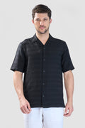 This black half-sleeve shirt offers a relaxed fit with a modern twist, featuring horizontal pleated stripes that create a dynamic, textured effect. Crafted from a flowy, bouncy fabric, it moves effortlessly with your body, providing both comfort and style. Perfect for casual outings or laid-back office days, this shirt combines a relaxed silhouette with a touch of sophistication