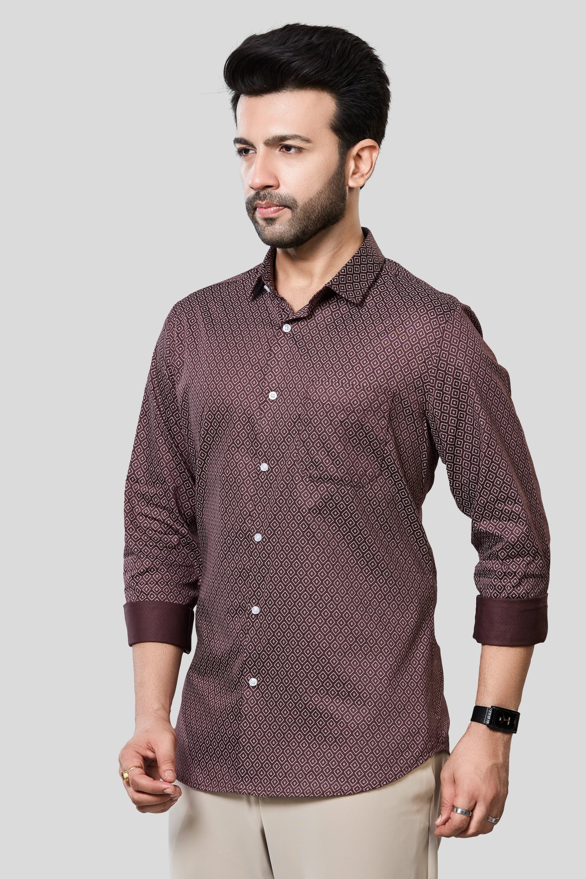Upgrade your wardrobe with our Satin Printed Formal Shirt, where classic tailoring meets contemporary design. Crafted from 100% pure cotton, this shirt offers the perfect blend of breathability, comfort, and a luxurious satin finish.