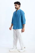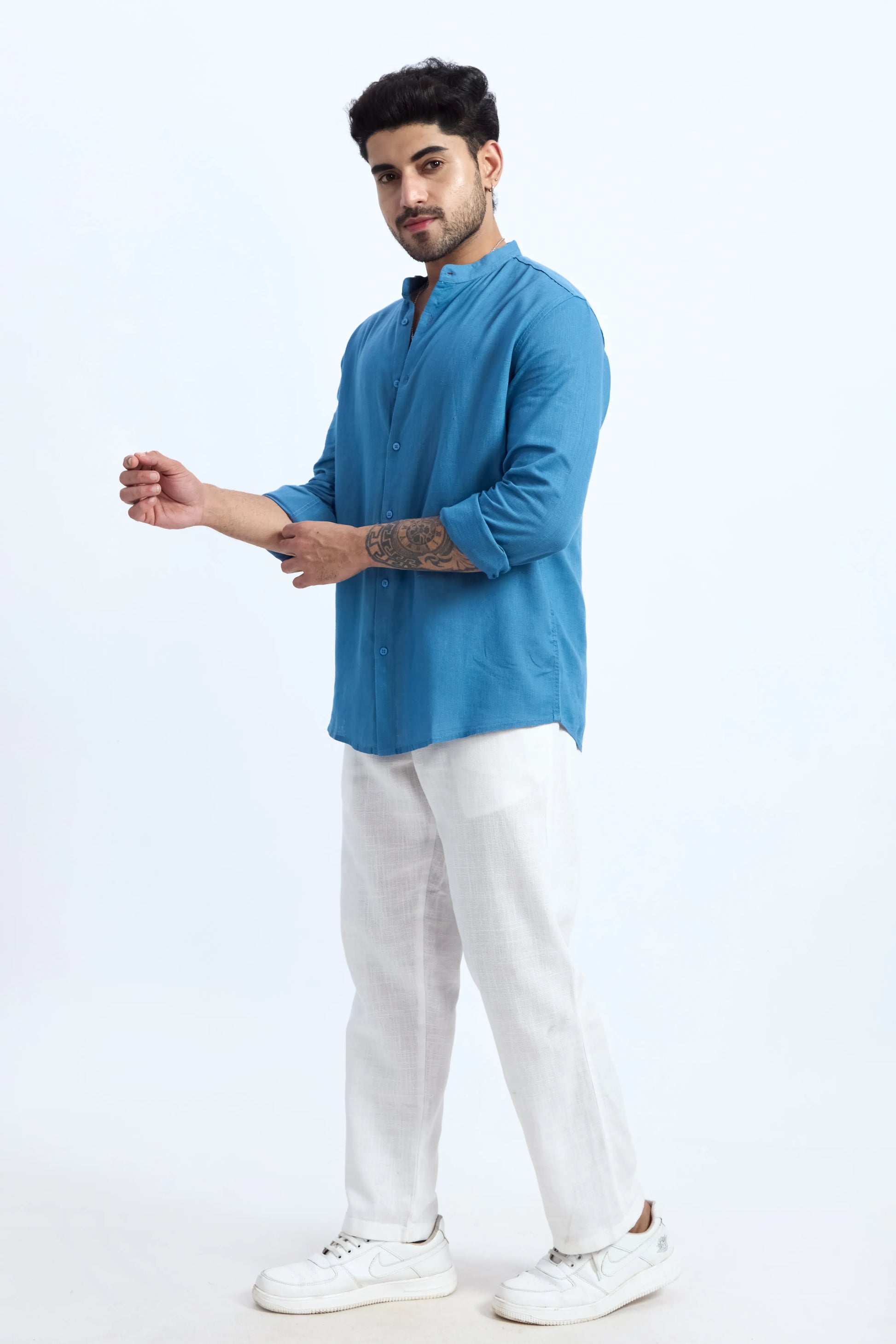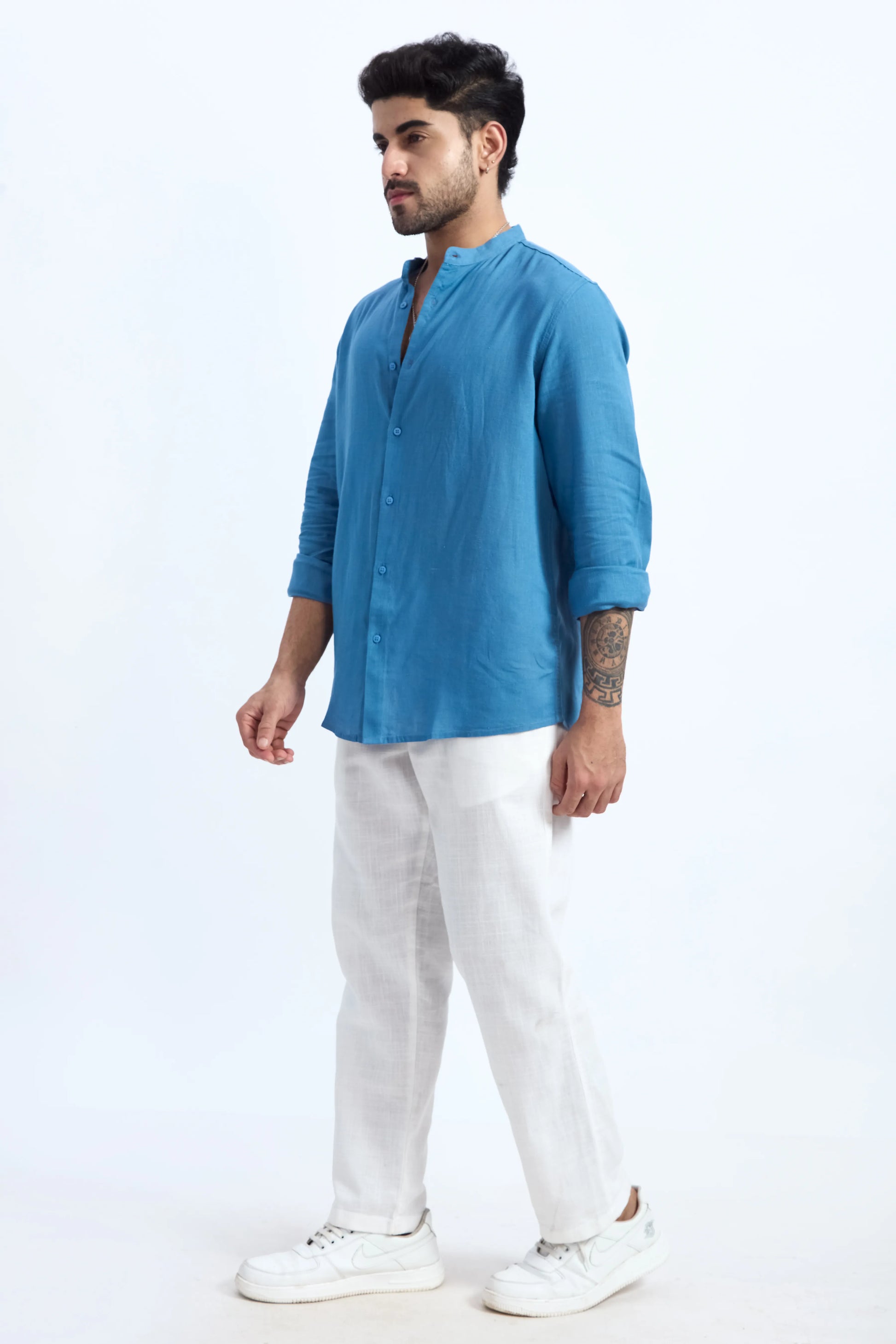 STEEL BLUE LINEN BLEND MANDARIN COLLAR SHIRT